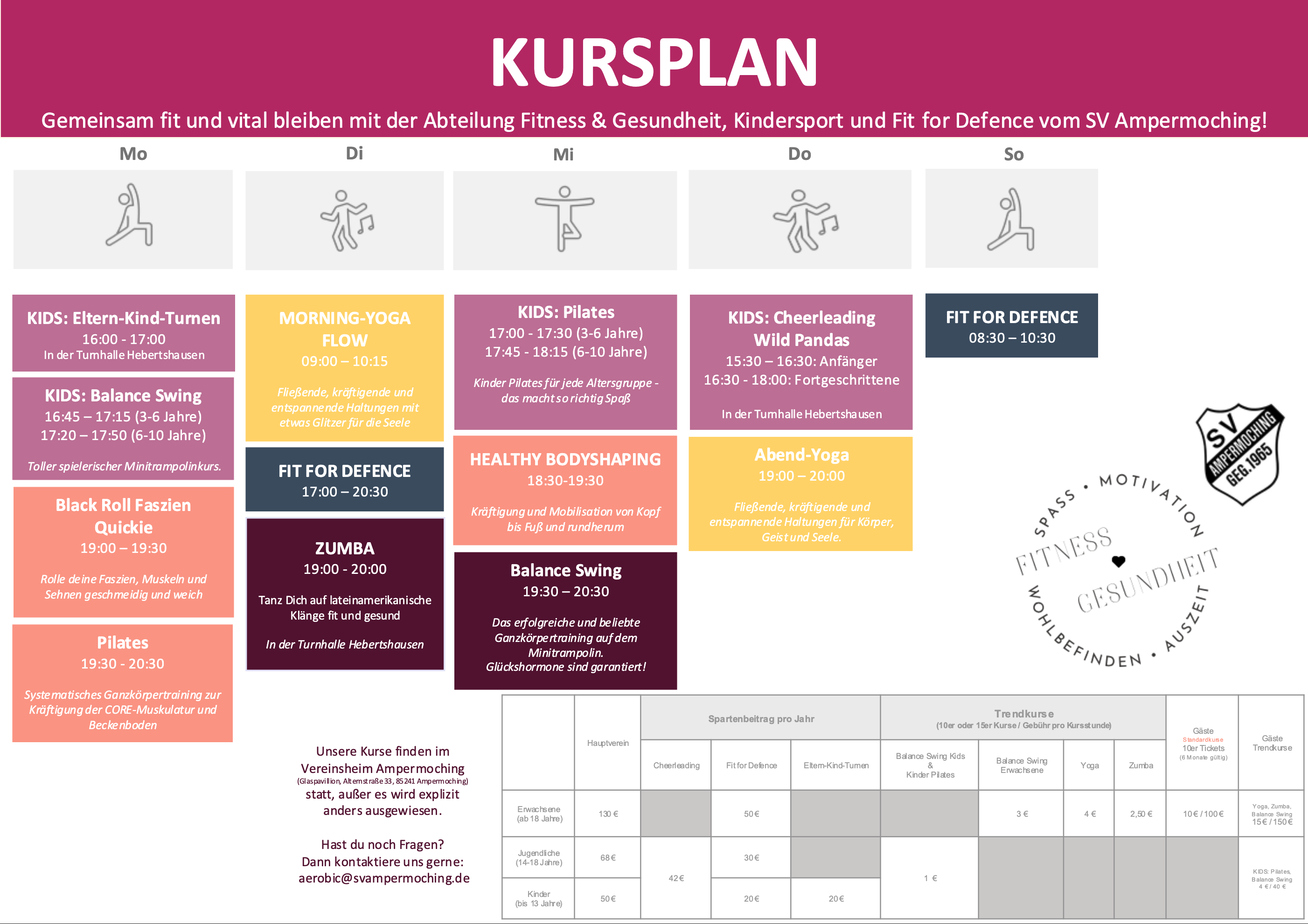 Von Klassikern wie Step Aerobic, Pilates und Rückenfit bis hin zu neuen Fitnesstrends wie Balance Swing, Yoga, Kinder Pilates, Zumba oder Fit for Defence. Jeder Kurs ist einzigartig und besticht mit seiner Kombination aus Kräftigung, Ausdauer, Koordination und viel Spaß.