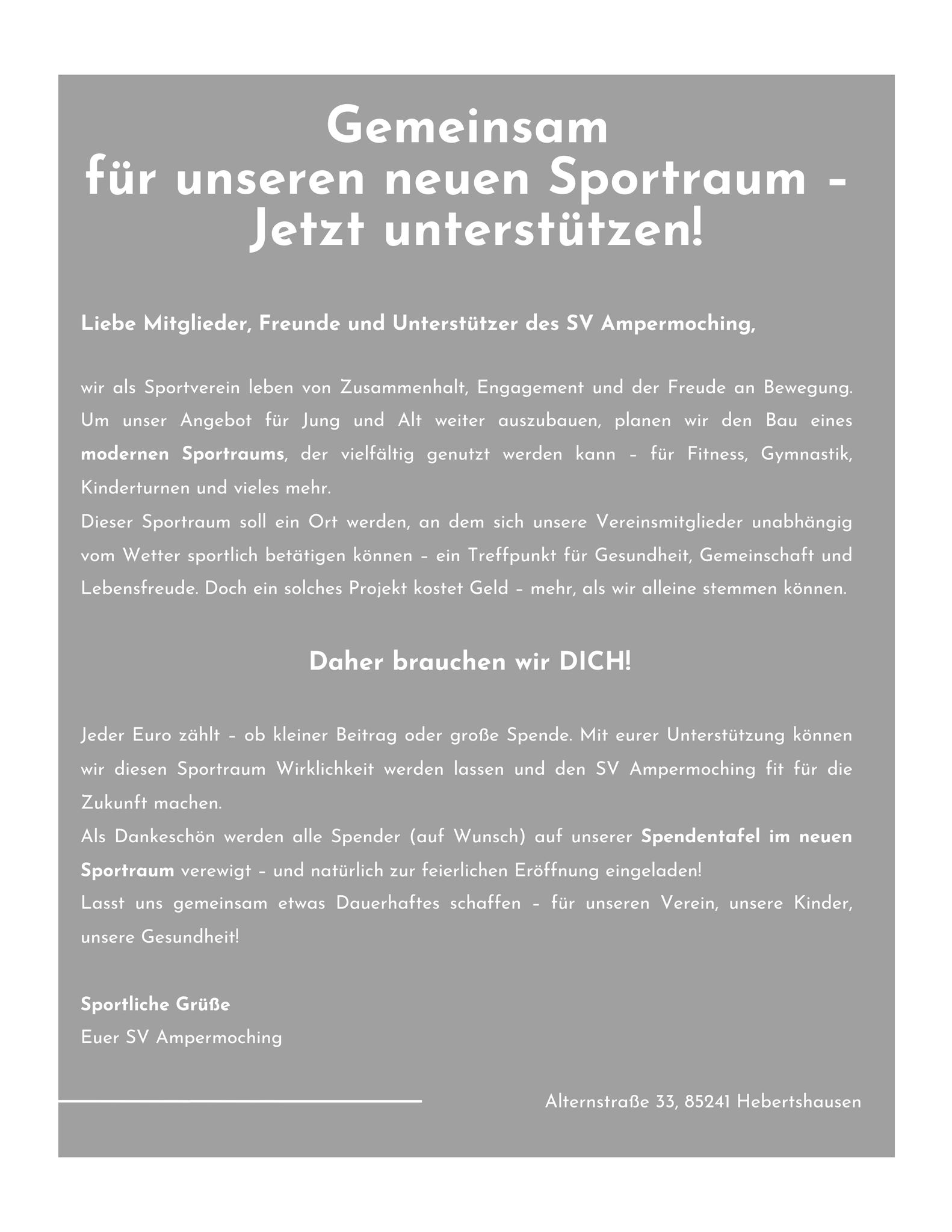 Am 17. Juni 1977 feierte ganz Ampermoching die Einweihung des neuen Vereinsheimes. Somit hat der Verein endgültig nach langer "Wanderschaft" einen festen Platz gefunden. Der Sportverein bezog die Anlage an der Alternstrasse 33 in Ampermoching, wo auch heute noch die Heimspiele der Fußballer stattfinden.